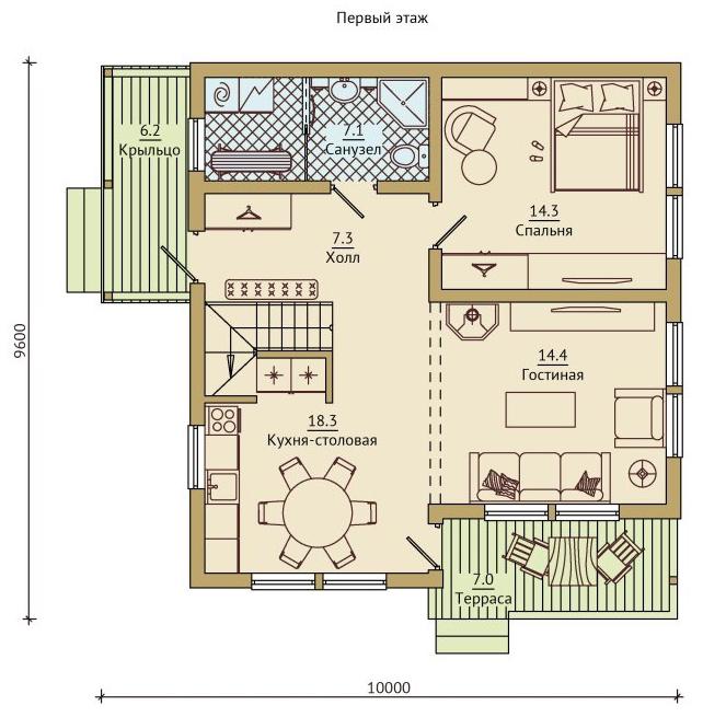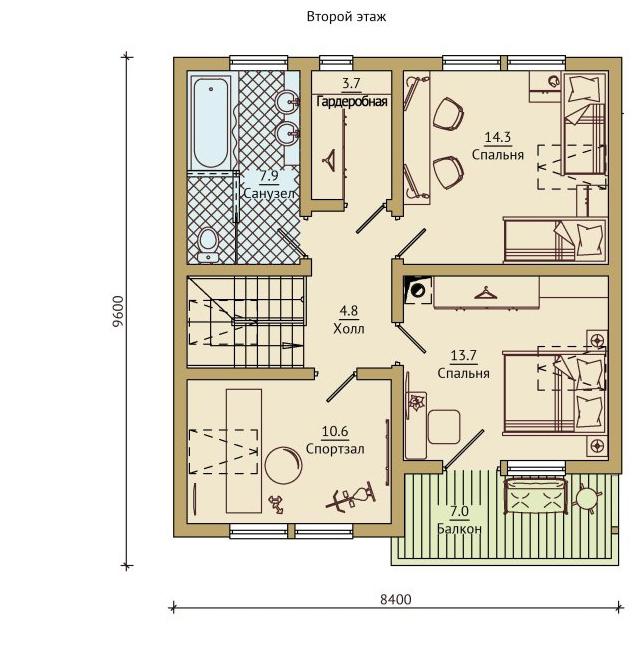 Здесь предусмотрено все: две уютные спальни - одна из которых, наверняка, понравится детям, а другая подойдет для родителей. На семиметровом балконе вечерами, когда дети уснут, можно выпить бокал вина в романтической обстановке. Большой санузел - почти восемь метров, где можно поставить не только экономичную душевую кабину, но при желании даже разместить джакузи; просторная гардеробная вместит постельное белье, пледы и, конечно, вашу одежду. И еще останется место для пусть и не слишком большого, но самого настоящего спортзала. И все это только на втором этаже.