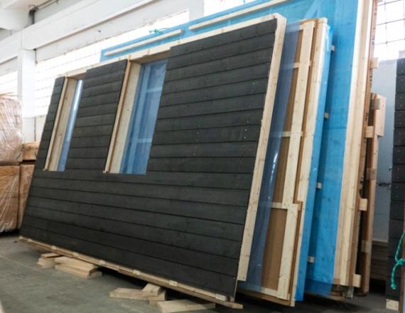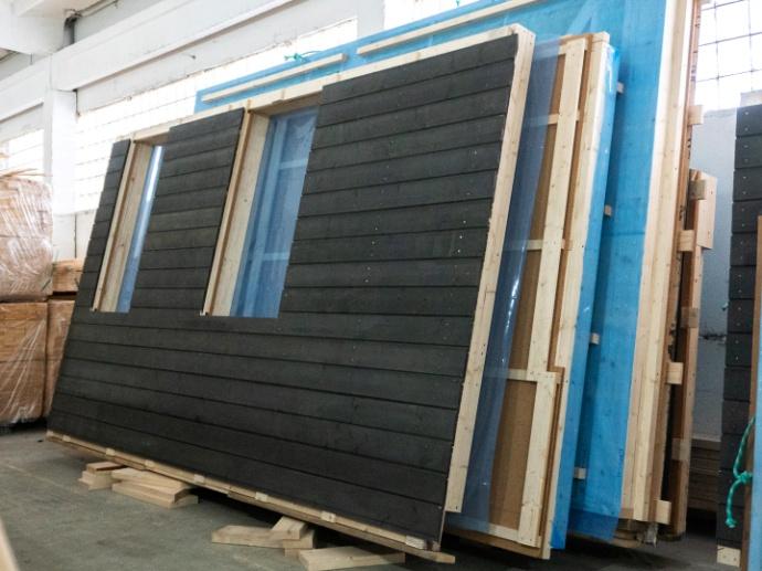 Панели уже включают утепление, ветрозащиту, пароизоляцию и даже деревянную наружную отделку. С