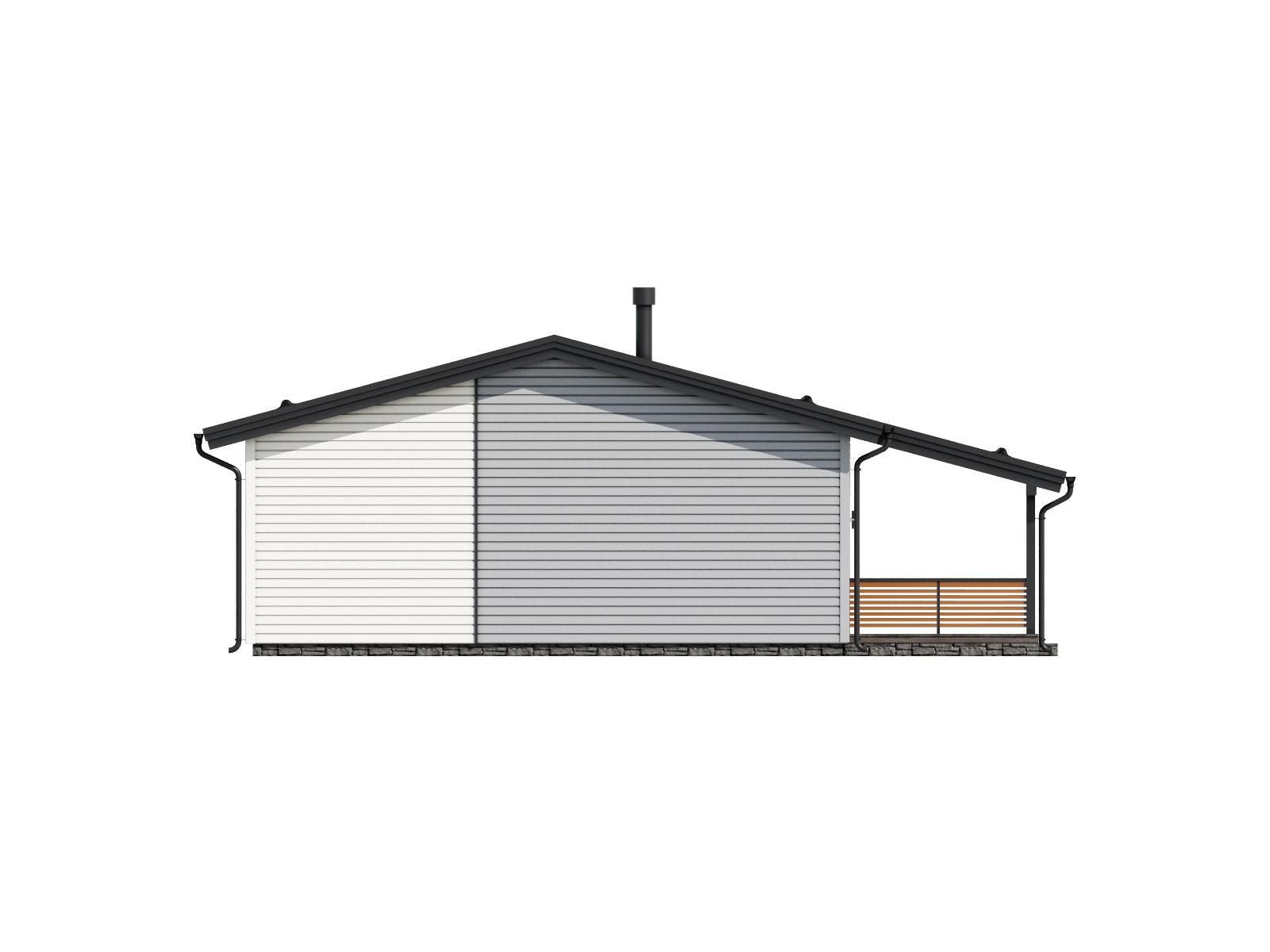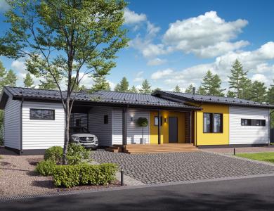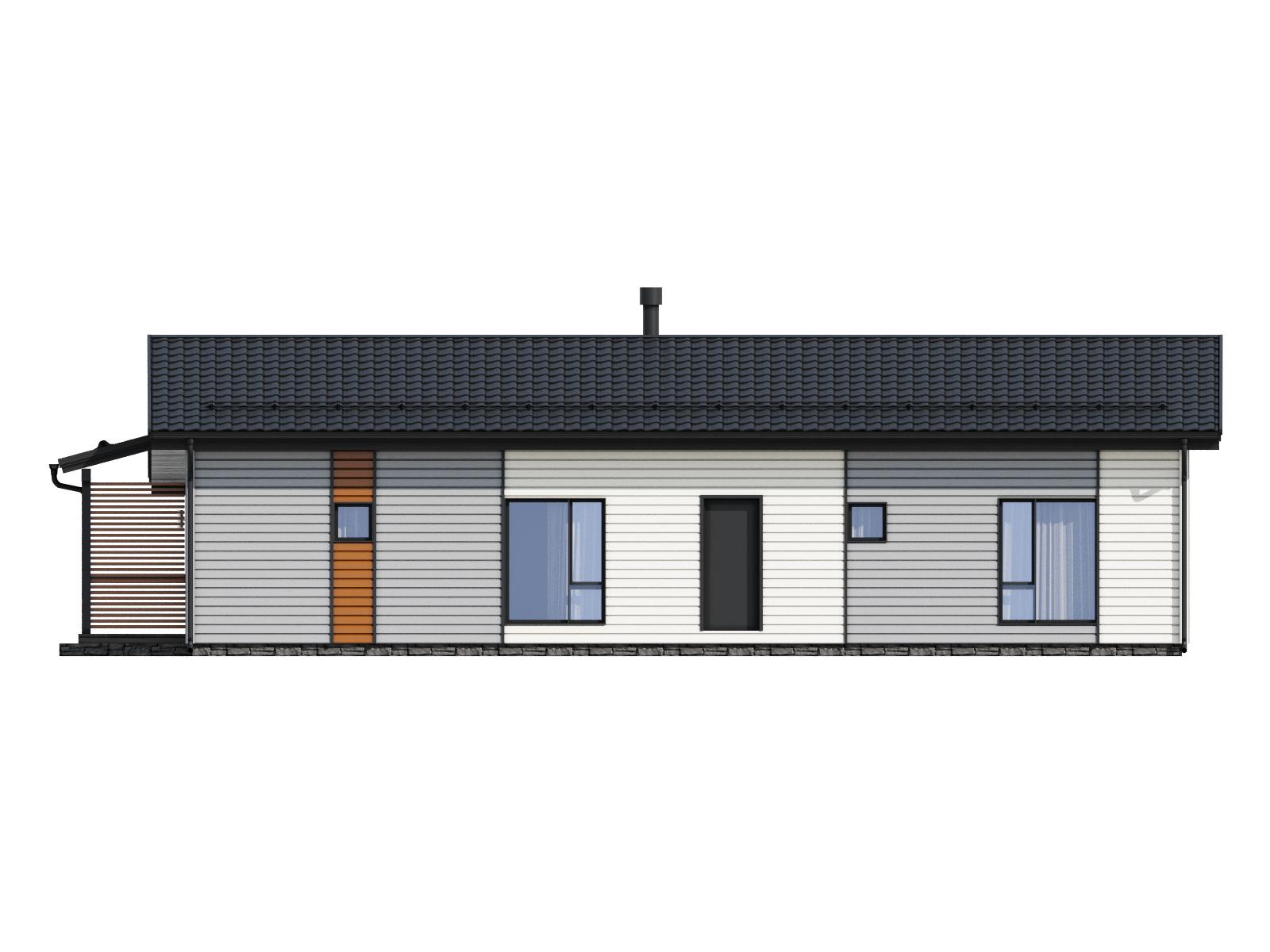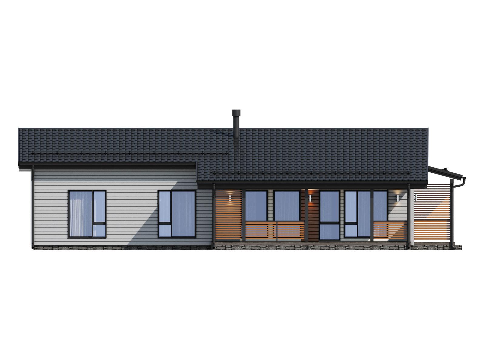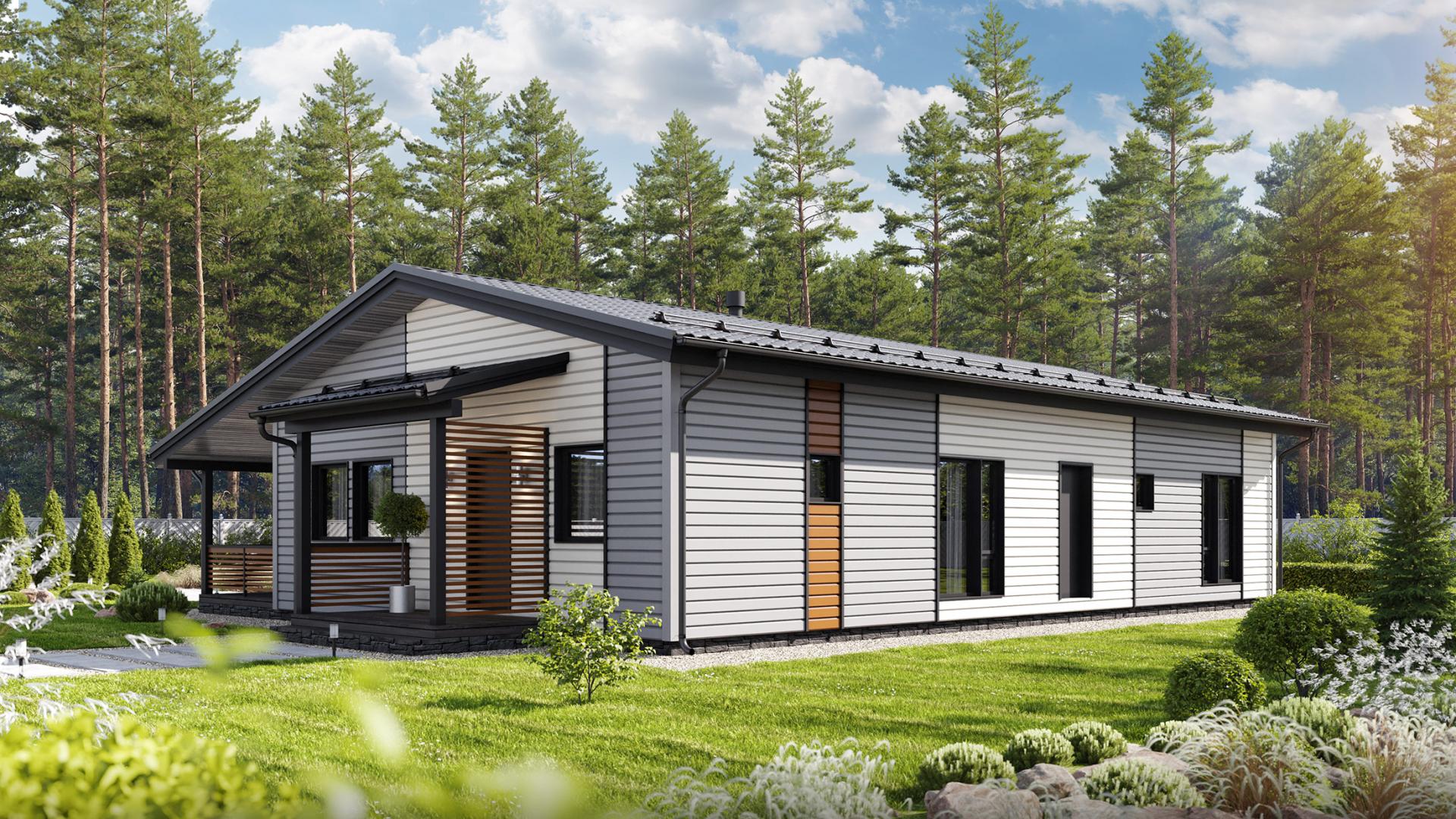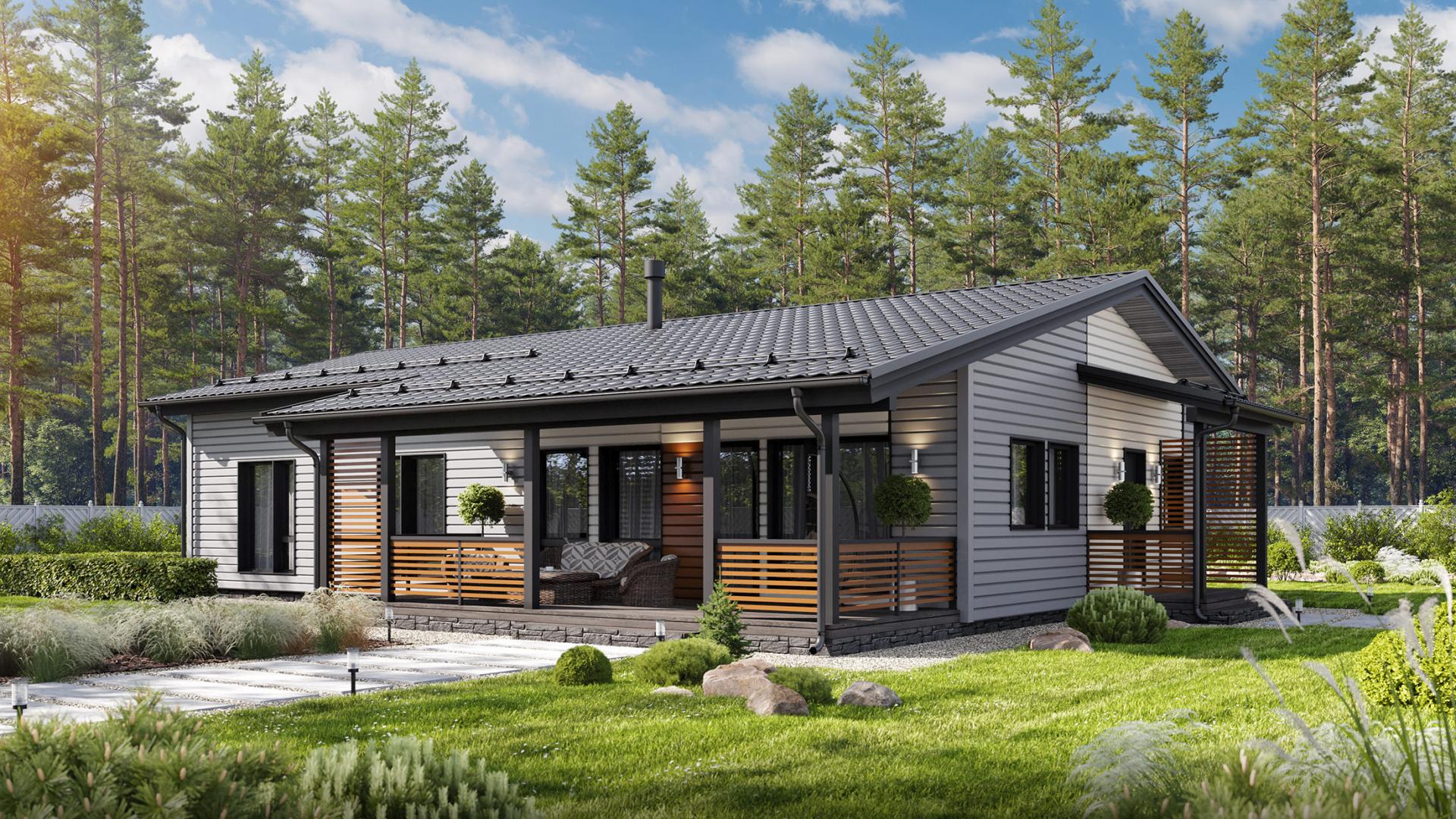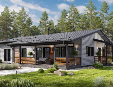 Комфортный и удобный дом с большой террасой для поклонников одноэтажных проектов в финском стиле. Трехцветный фасад в сдержанных тонах выделяет дом среди остальных. Подходит для семьи из 4 человек.