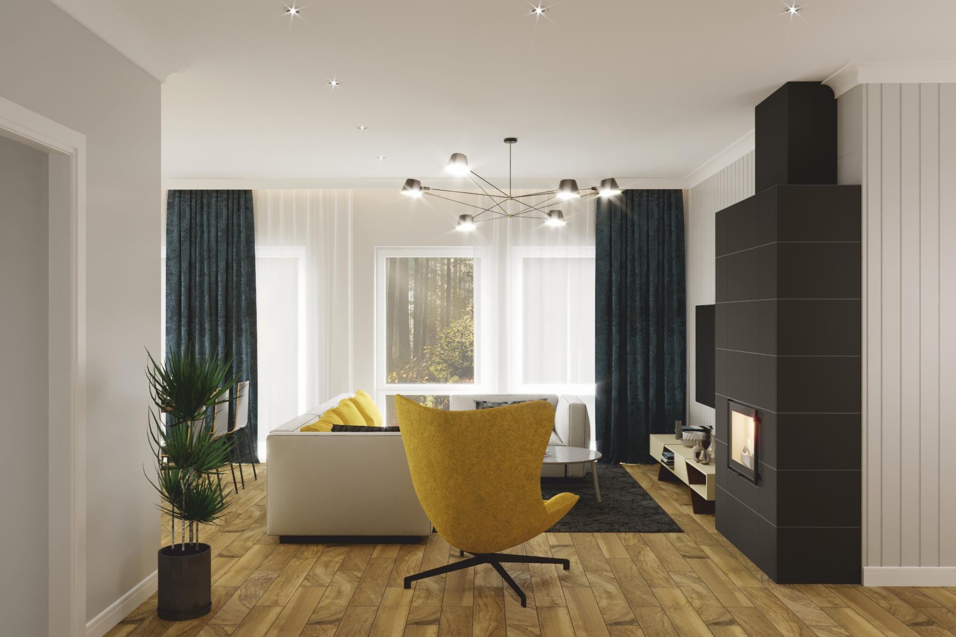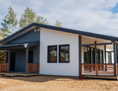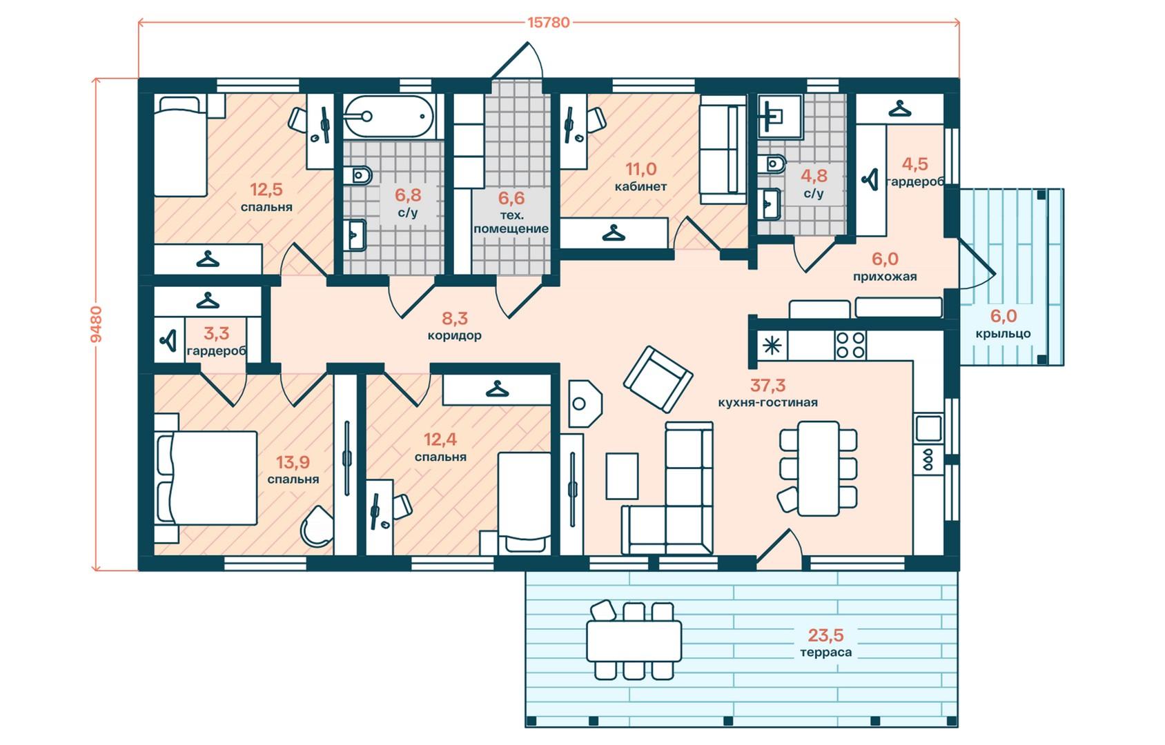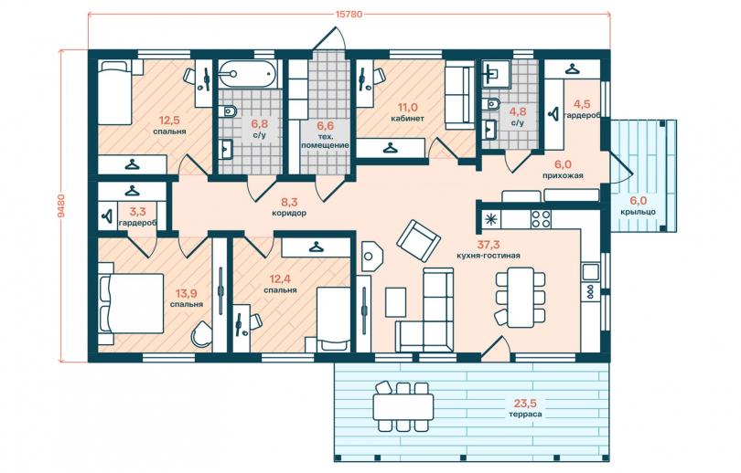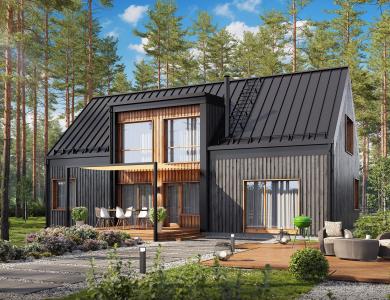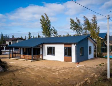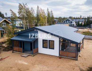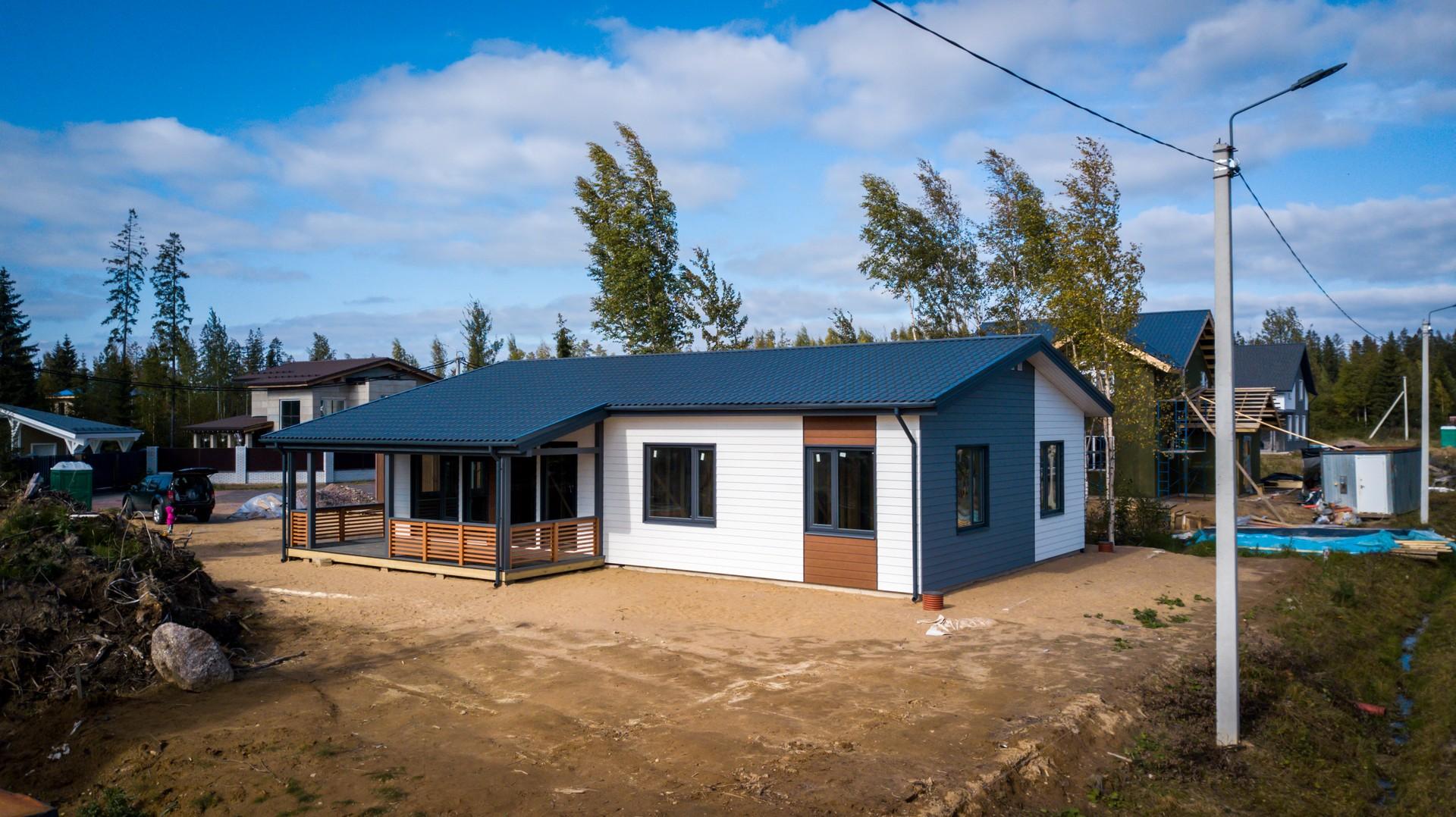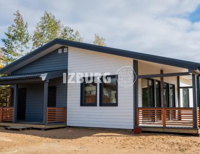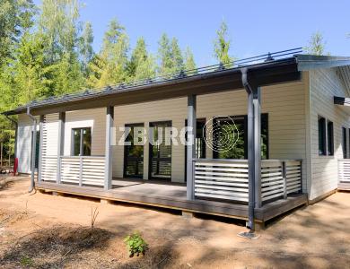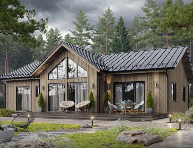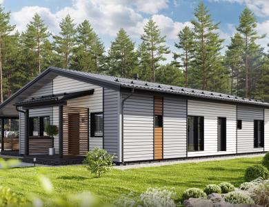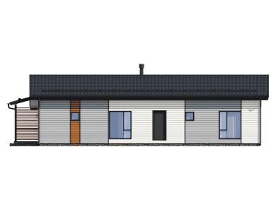 Комфортный и удобный дом с большой террасой для поклонников одноэтажных проектов в финском стиле. Трехцветный фасад в сдержанных тонах выделяет дом среди остальных. Подходит для семьи из 4 человек.