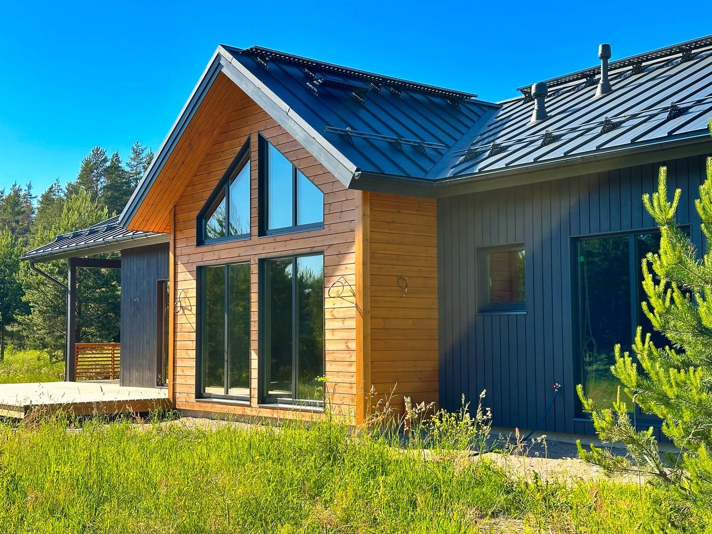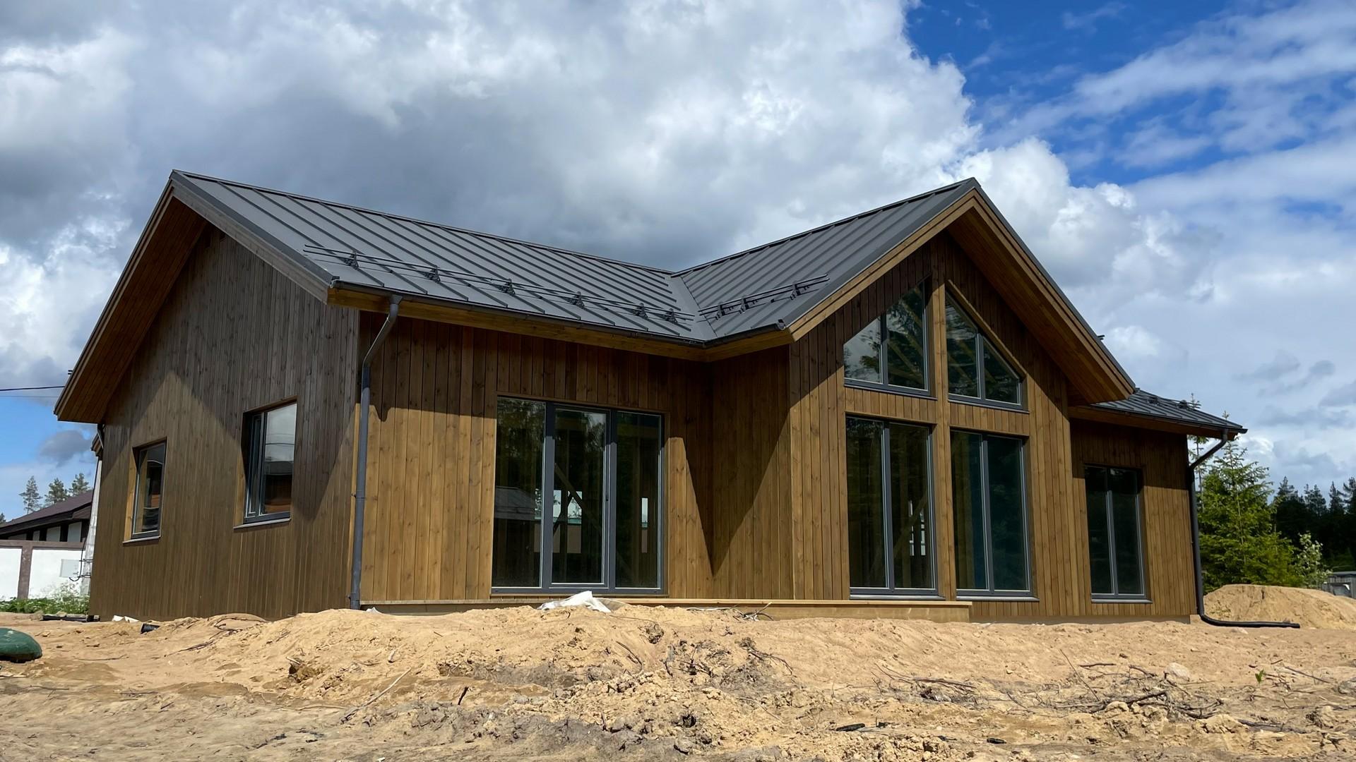 Наружная отделка Монтируем на наружные стены имитацию бруса, скандинавскую доску, планкен или наносим декоративную штукатурку. По окончанию монтажа производим финишную покраску деревянных элементов. Выполняем подшивку карнизных свесов, оснащаем дом водосточной системой. |