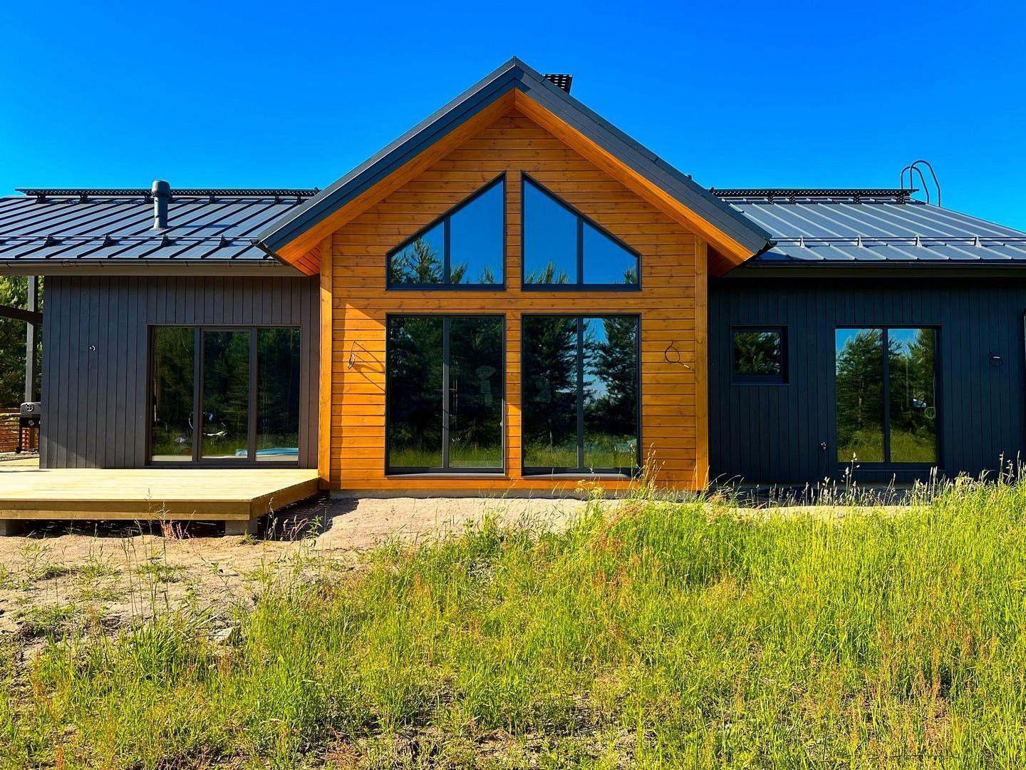 Внешняя отделка: облицовка фасада имитацией бруса, отделка углов, откосов, наличники окон и дверей, настил террас и балконов, устройство ограждений. Устройство карнизов, подшивка кровельных свесов. Покраска всех элементов Tikkurila в/д фасадная Pika-Teho